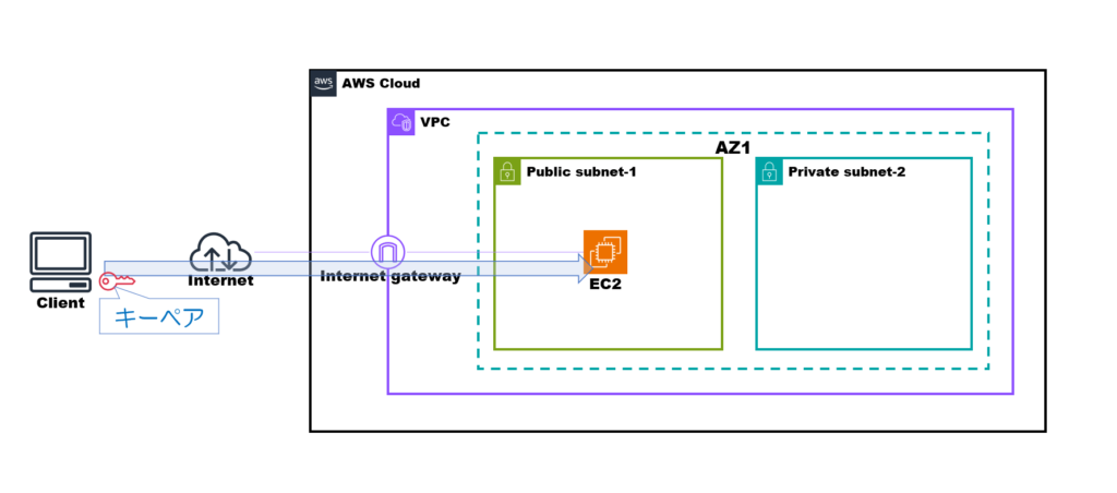 まずは構成図!今回は、パブリックなサブネットにおいて、キーペアを使ってアクセスするのが目標です。構成図はこんな感じです~