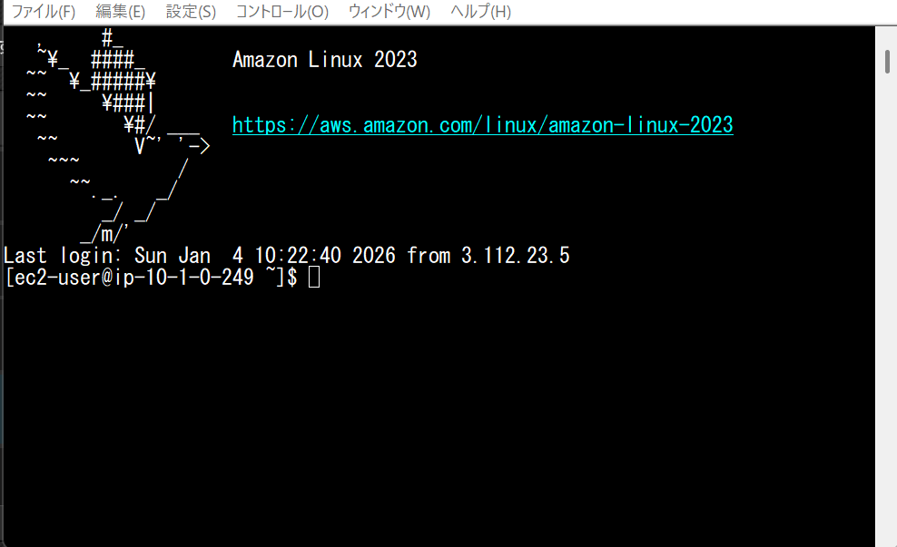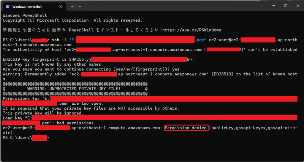 ssh -i "C:¥User\ユーザー名\.ssh\キーペア名.pem" ec2-user@ec2-xx-xxx-xxx-xxx.ap-northeast-1.compute.amazonaws.com