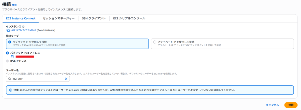 今回は当然、パブリックIPを使用して接続しかできないです。