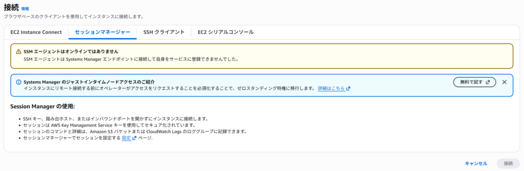 次がSSM接続のタブです。前提条件を満たしてないので、この方法での接続は不可です。