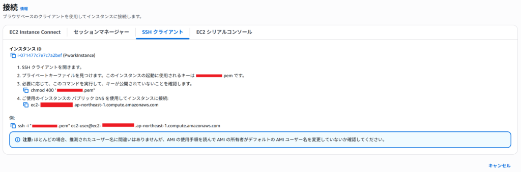 ssh -i "キーペア名.pem" ec2-user@ec2-xx-xxx-xxx-xxx.ap-northeast-1.compute.amazonaws.com