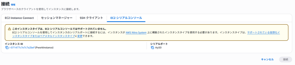 アカウントに対して、EC2シリアルアクセスを有効にして、IAMユーザーに対して権限を追加するなどしらできるようですが、今回はやりません。また機会あればやってみようかとも思いますが…と言う訳で今回は接続不可!です!