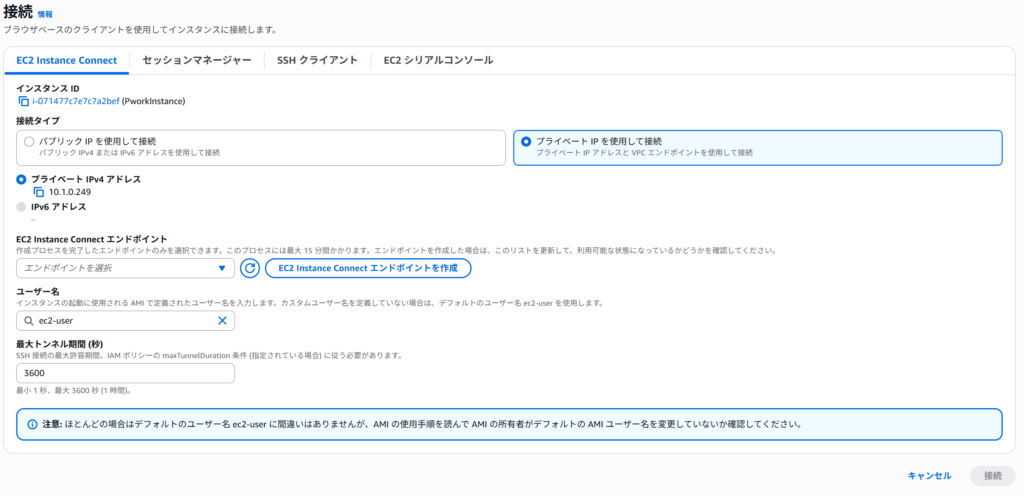 プライベート接続の方は、以下のようになります。EC2 Instance Connectエンドポイントのところで作成するを選ぶとおそらくプライベートIPでの接続も可能となりますが、VPCエンドポイントは高いのでやめておきます。