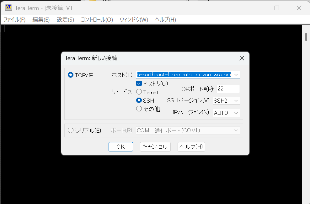 続いてTeraTermを起動。して以下の画面でホストに先ほどコピーしたパブリックDNSをコピーしてOKクリックです。