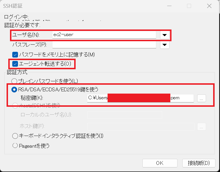 RSA/DSA/ECDSA/ED25519鍵を使うのオプションボタンを選んで、鍵の場所を指定。