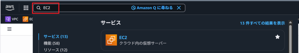 ②虫眼鏡の検索欄に「EC2」を入力して、サービスEC2をクリックです。